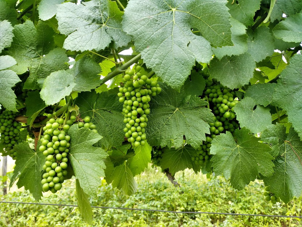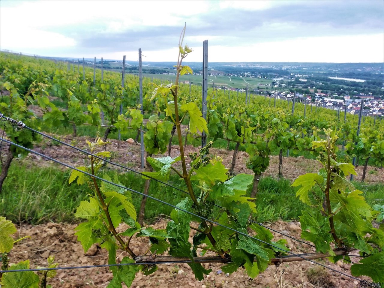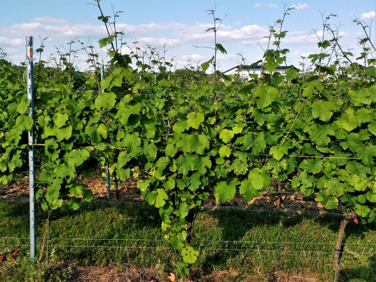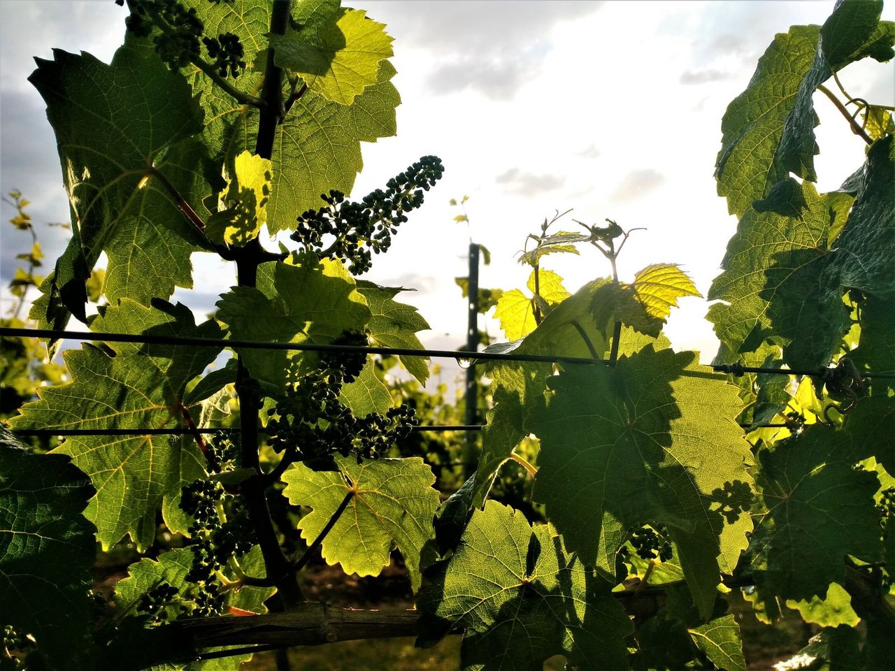 花が落ち、果実が大きくなり始めている。ここから1か月ほどかけて粒が大きくなり、その後に熟成期へ移っていく。枝もどんどん伸びていて、そろそろ成長点(枝の先端)をカットするブドウ畑も出てくるだろう。