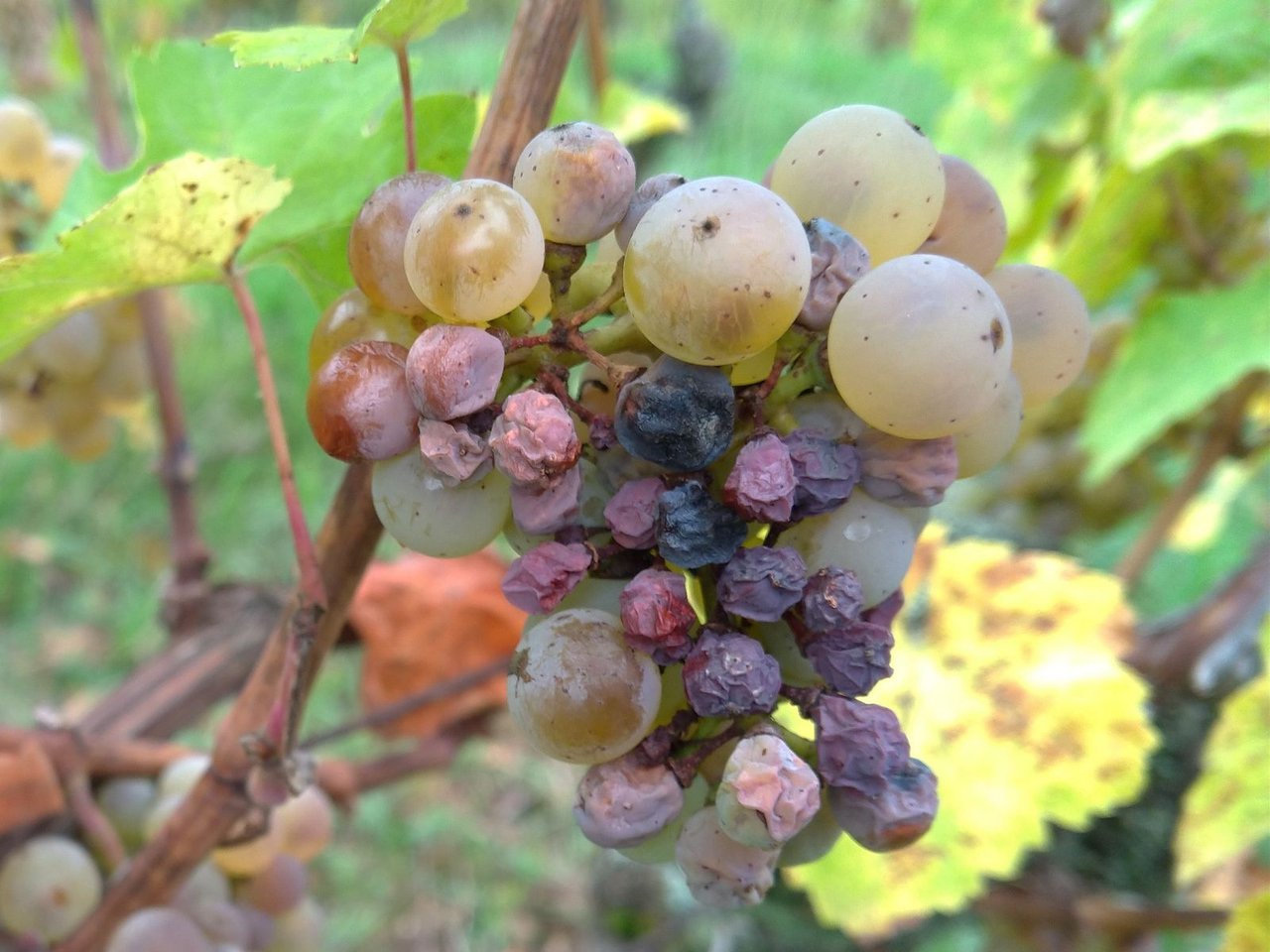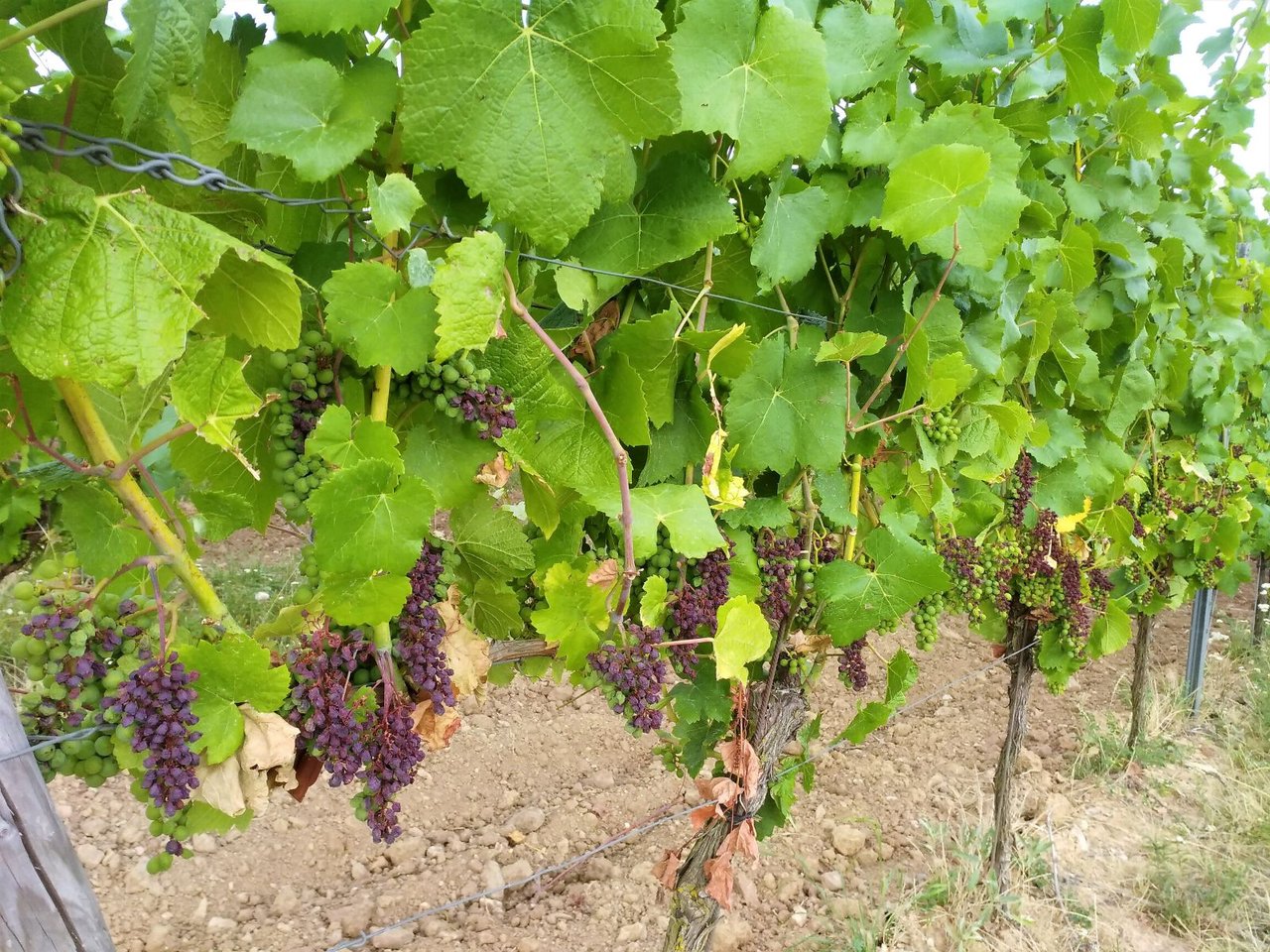 1枚目、2枚目がRieslingで房の上の方から色味が明るくなってきている。実も少しずつ柔らかくなっていていよいよ熟成期へ。黒ぶどうも4枚目写真の様に色づき始めている。品種によって赤くなる時期が結構異なり、すでにほとんどの房が赤黒くなっているものもあったりする。本来なら房の見た目である程度の品種の予想がつかないといけないんだけど、、まだまだ勉強不足。。