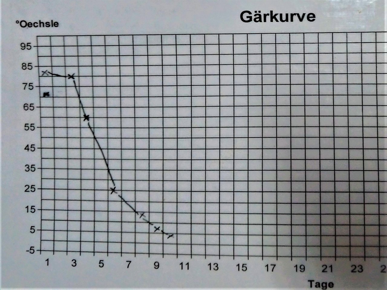 そして、Keller(ワインセラー)内では絶賛発酵中(1枚目写真)。ちなみに2枚目写真は、発酵の状態を表したグラフ(少し発酵が早すぎるパターン。)。このように、定期的に糖分(エクスレ)を測定して発酵状態を確認しながら目標とする糖度のワインに仕立てていく。
