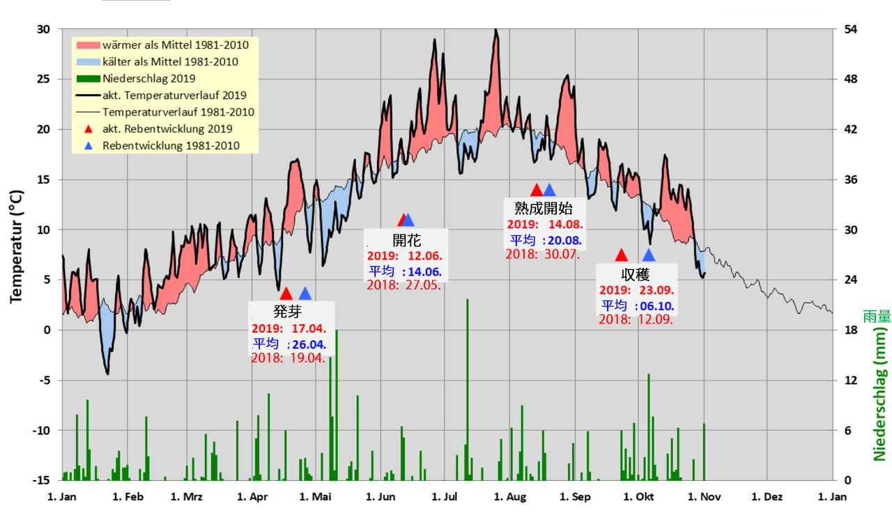 ここでガイゼンハイムの2019年の天気(気温と雨量)とブドウの成長の関係、さらには2018年との比較を見ておこうと思う。