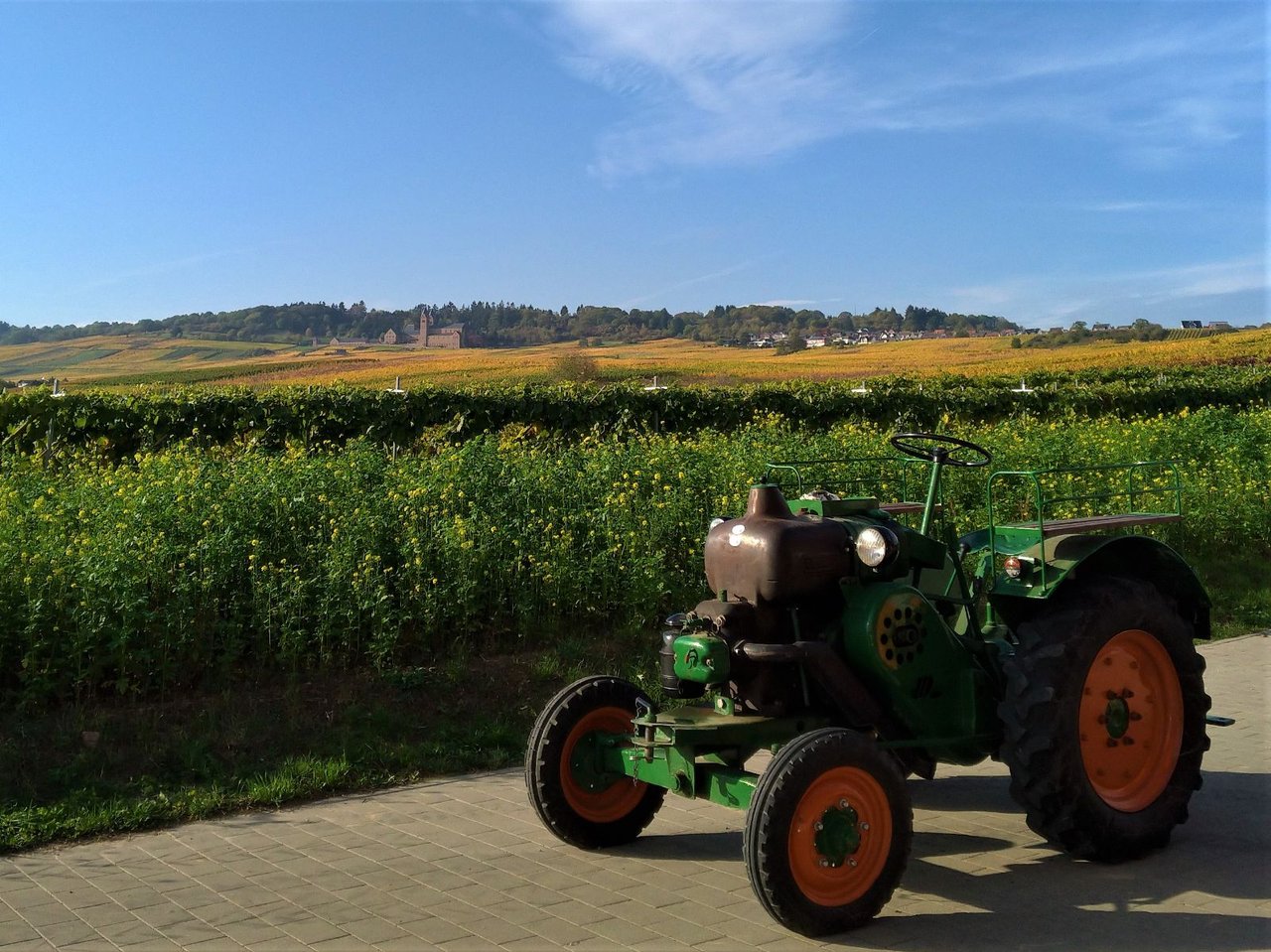 品種によって色付き方は様々。リースリングは黄色く色付き(1枚目)、Spätburgunderは赤や黄色に色付く(2枚目は赤い例)。次の写真のCabernet Mitosは濃い赤ワインの色味に色付く。茎まで赤くなる品種もあったりして面白い。Rheingau地域はリースリングが80%近くを占めるので、ブドウ畑はほぼ黄色く変わっていく。