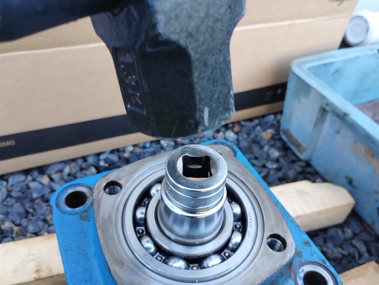 飛び出た軸をハンマーで叩いて、軸のパーツを取り出す。写真のように同じくらいの径のソケットをあててやると良い。